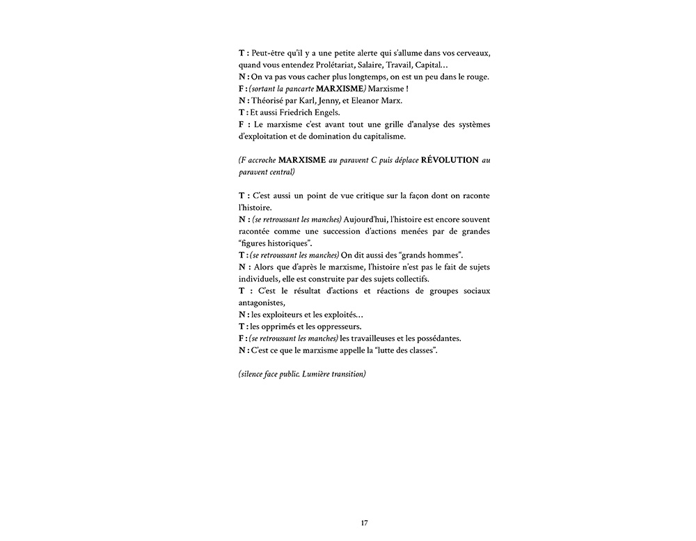 Le texte du spectacle Pour Nous, l'Oubli des Souffleuses de Chaos ! Pour Nous, l'Oubli est un spectacle pour 3 comédiennes sur le rôle des femmes dans les mouvements révolutionnaires et sur l'impact que leur progressive invisibilisation a sur les femmes, les citoyennes, que nous sommes aujourd'hui. Les mouvements révolutionnaires se sont en effet construits grâce à la mobilisation des travailleuses et ouvrières et pourtant elles sont absentes des récits qui en sont faits. Rares sont les figures féminines que l'histoire retient. Parmi elles, les Souffleuses de Chaos ont choisi de retracer les combats de Louise Michel, Alexandra Kollontaï et Dolores Ibárruri. Chacune de ces femmes a eu un impact majeur sur le développement des mouvements d'émancipation. Pourtant, l'Histoire les a progressivement occultées et leurs combats sont aujourd'hui largement méconnus. |